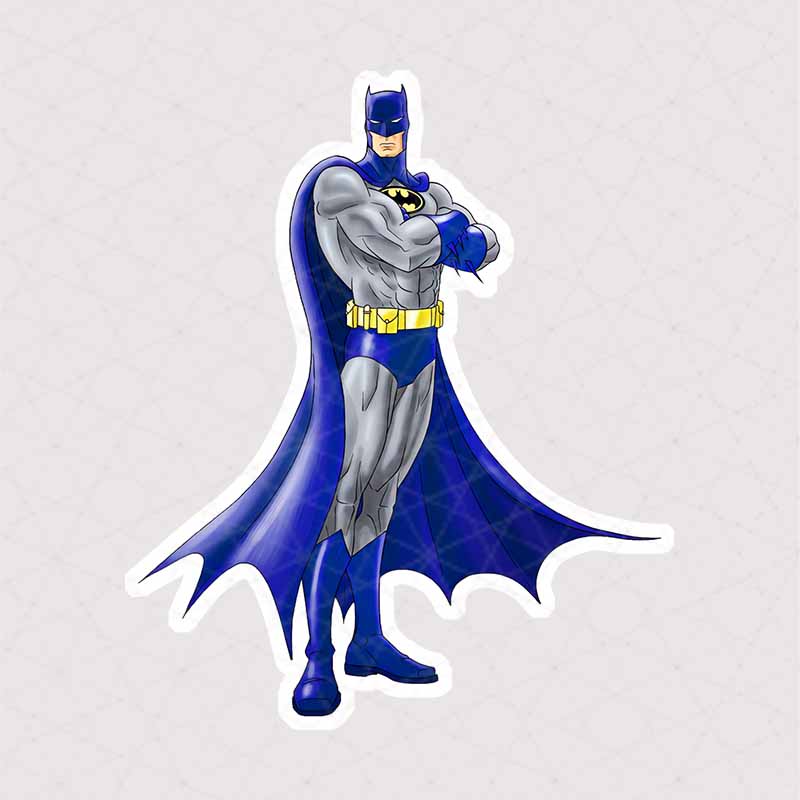استیکر BATMAN با شنل آبی ، را میتوانید در سایز های مختلف و 3 مدل کاغذی – پارچه ای و ژله ای از پچول خریداری کنید