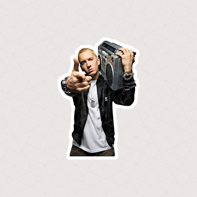 استیکر امینم و ضبط صوت ، را میتوانید در سایز های مختلف و 3 مدل کاغذی – پارچه ای و ژله ای از پچول خریداری کنید