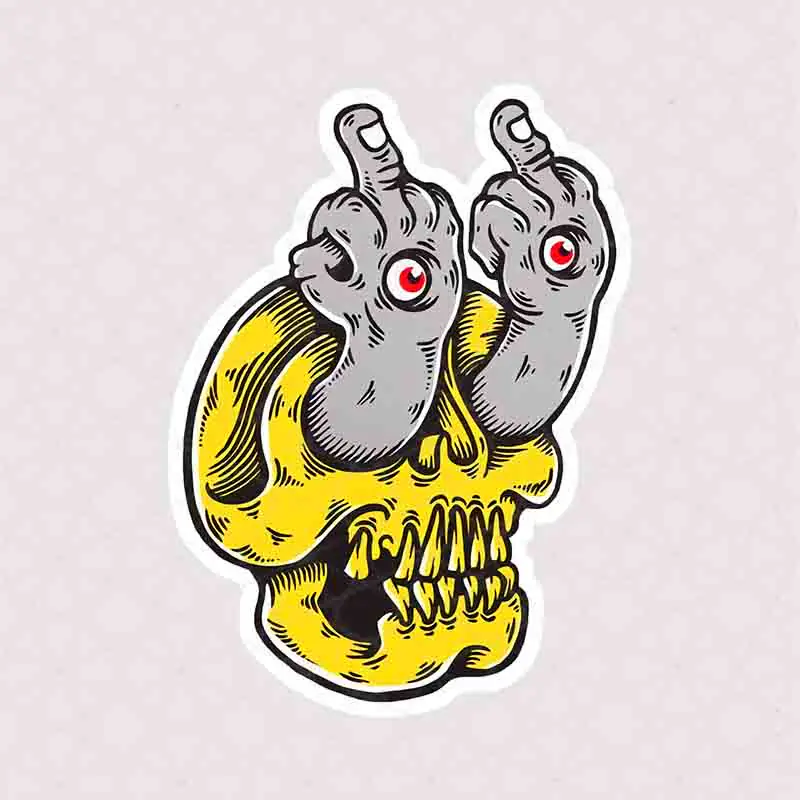 این استیکر تصویری از یک جمجمه با دو دست استخوانی که از چشمهایش بیرون زدهاند را نشان میدهد. این استیکر میتواند برای تزئین لپتاپ، کولهپشتی، دفتر یا هر چیز دیگری که دوست دارید مناسب باشد.