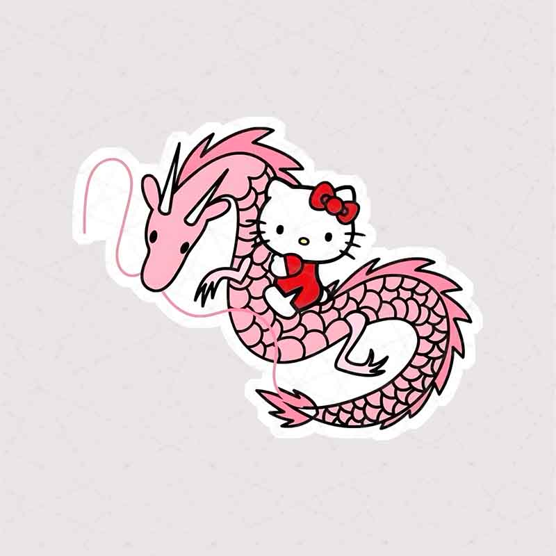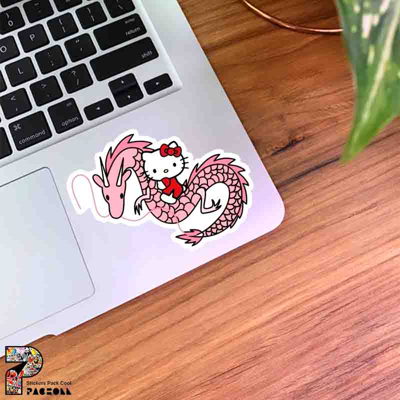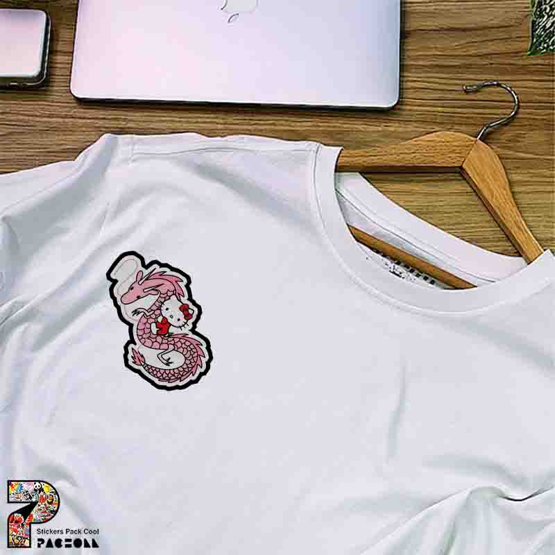 استیکر هلو کیتی سوار بر اژدهای صورتی ، را میتوانید در سایز های مختلف و 3 مدل کاغذی – پارچه ای و ژله ای از پچول خریداری کنید
