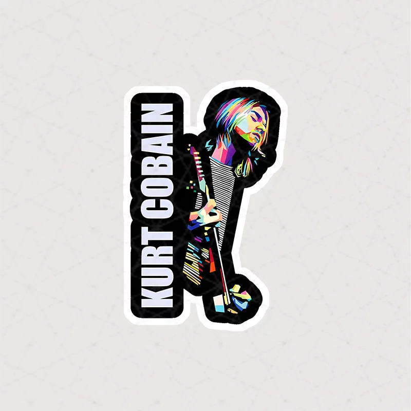 استیکر کرت کوبین طرح رنگی همراه با متن Kurt Cobain ، را میتوانید در سایز های مختلف و 3 مدل کاغذی – پارچه ای و ژله ای از پچول خریداری کنید