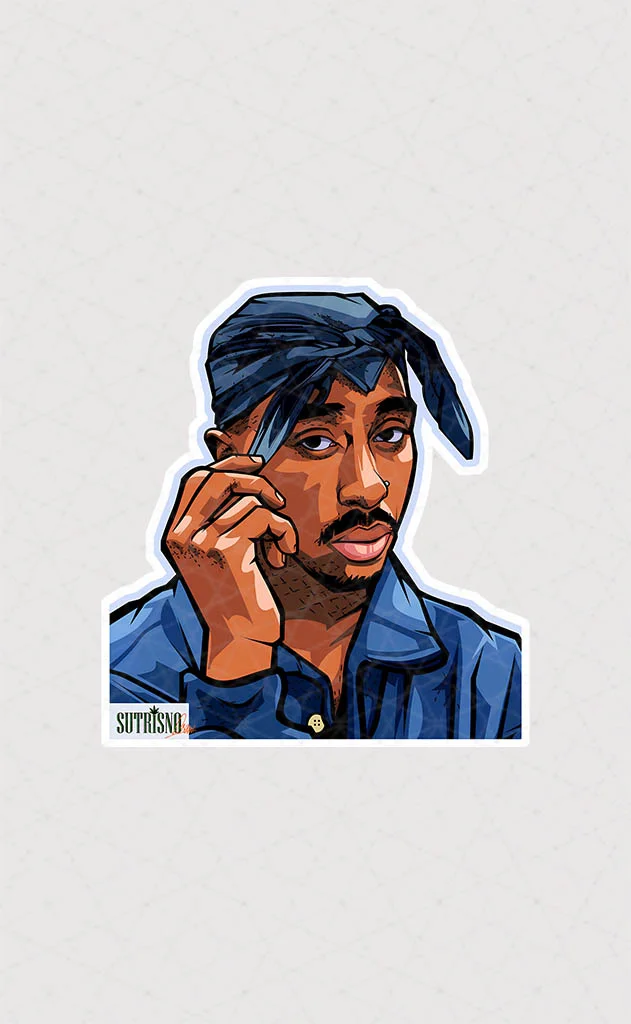 استیکر 2Pac همراه با لباس و دستمال سر آبی ، را میتوانید در سایز های مختلف و 3 مدل کاغذی – پارچه ای و ژله ای از پچول خریداری کنید